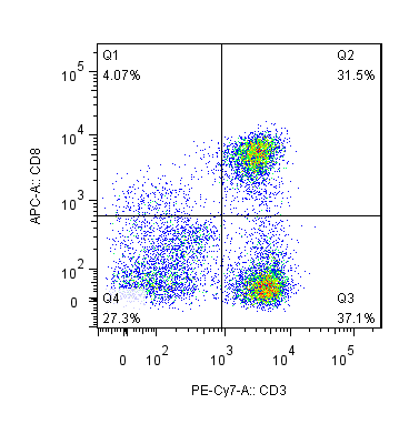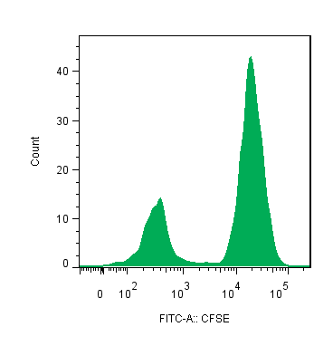 荧光染料CFSE(CFDA-SE),是一种可对活细胞进行荧光标记的新型染料,能够轻易穿透细胞膜,在活细胞内与胞内蛋白共价结合,水解后释放出绿色荧光。在细胞分裂增殖过程中,它的荧光强度会随着细胞的分裂而逐级递减,标记荧光可平均分配至两个子代细胞中,因此其荧光强度是亲代细胞的一半,根据这一特性,它可被用于检测细胞增殖,细胞周期的估算及细胞分裂等方面。另外,CFSE标记的细胞用于体内观察可以长达数周之久,它常被用来做活体细胞检测实验和用荧光电镜观察细胞长期活动的实验。荧光探针CFSE进入细胞后定位于细胞膜、细胞质和细胞核,在细胞核的荧光染色最强,并证实CFSE不影响细胞的增殖能力。利用流式检测CFSE在细胞中的强弱分析细胞增殖方法简单,且不用放射性同位素,不存在安全隐患。可以更快速,更准确和更安全的得到想要的实验数据。