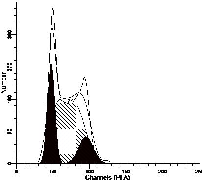 流式检测细胞周期,是在临床医学中应用于肿瘤检测的一种有效手段。首先需要把实体瘤组织解聚、分散制备成单细胞悬液,用荧光染料(碘化吡啶PI)染色后对细胞的DNA含量进行分析,将不易区分的群体细胞分成三个亚群(G1期,S期和G2期),DNA含量直接代表细胞的倍体状态,非倍体细胞与肿瘤恶性程度有关。