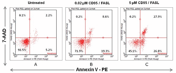 在正常细胞中,磷脂酰丝氨酸(PS)只分布在细胞膜脂质双层的内侧,而在细胞凋亡早期,细胞膜中的磷脂酰丝氨酸(PS)由脂膜内侧翻向外侧。Annexin V是一种依赖性磷脂结合蛋白,与磷脂酰丝氨酸有高度亲和力,可通过细胞外侧暴露的磷脂酰丝氨酸与凋亡早期细胞的胞膜结合。Annexin V被作为检测细胞早期凋亡的灵敏指标之一。将Annexin V进行荧光素标记,以标记了的Annexin V作为荧光探针,利用荧光显微镜或流式细胞仪可检测细胞凋亡的发生。碘化丙啶(Propidium Iodide, PI)是一种核酸染料,它不能透过完整的细胞膜,但对凋亡中晚期的细胞和死细胞,PI能够透过细胞膜而使细胞核染红。因此将Annexin V与PI匹配使用,就可以将处于不同凋亡时期的细胞区分。