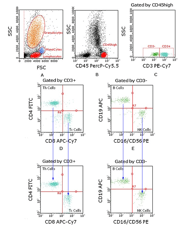 通过荧光抗原抗体检测技术对细胞表面抗原分析,进行细胞分类和亚群分析。这一技术对于人体细胞免疫功能的评估以及各种血液病及肿瘤的诊断和治疗有重要作用。有大量文献记载了淋巴细胞亚群等在各种疾病中的变化。正常人群淋巴细胞T4/T8比值大约为2∶1,但在人体细胞免疫力低下时可出现比例倒置。用流式技术还可以监测肾移植后病人的肾排斥反应,如果T4/T8比例倒置,病人预后良好,较少发生肾排异现象;反之排异危险性增加。同样此种测定技术也用于艾滋病的诊断和治疗中。还有研究记载了外周血淋巴细胞免疫表型的参考值,并对其种族、性别、年龄等影响因素进行了研究。